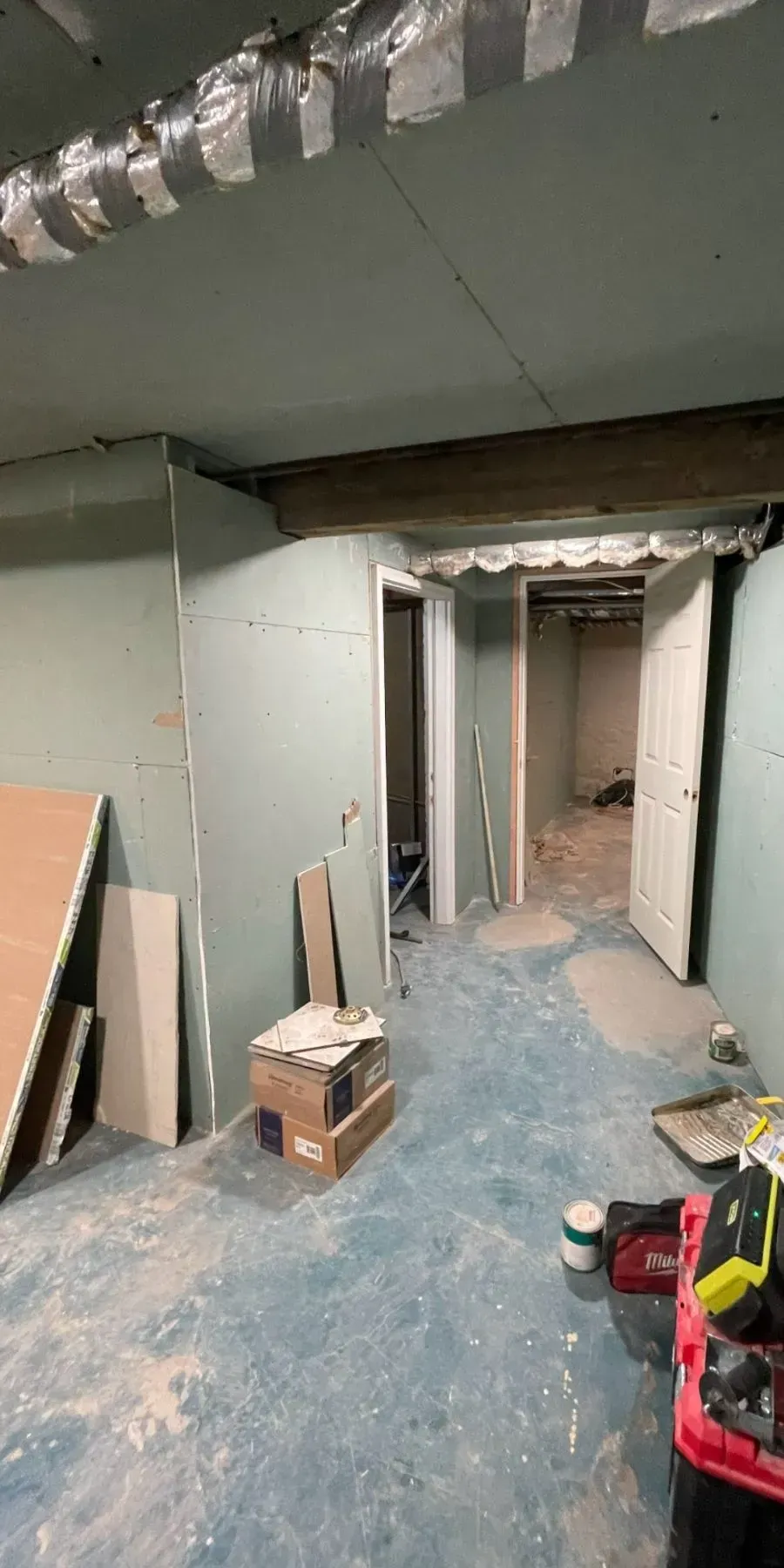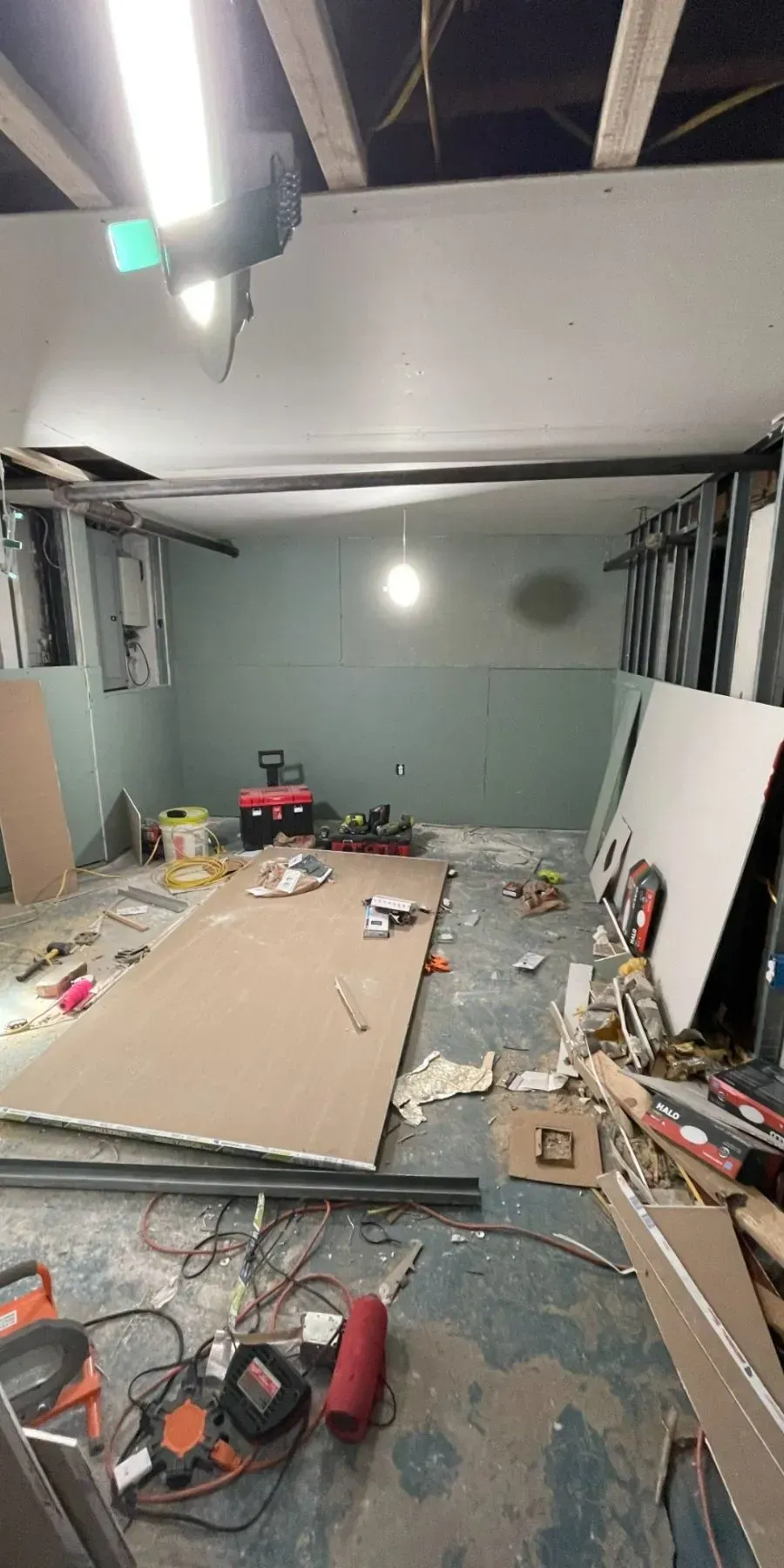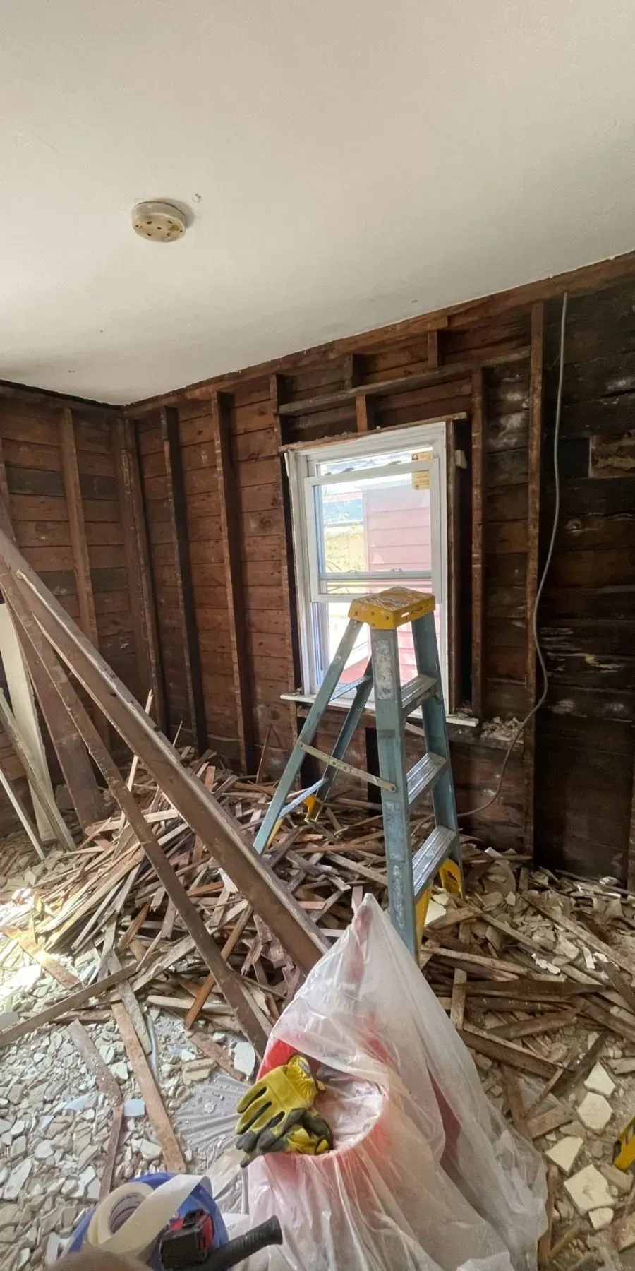 This room was stripped down to the studs to address old materials and prepare for a full rebuild. We installed new framing, updated the walls, and finished the space with fresh paint and flooring. The completed renovation gives the room a clean, modern look and transforms it into a functional living space once again.
