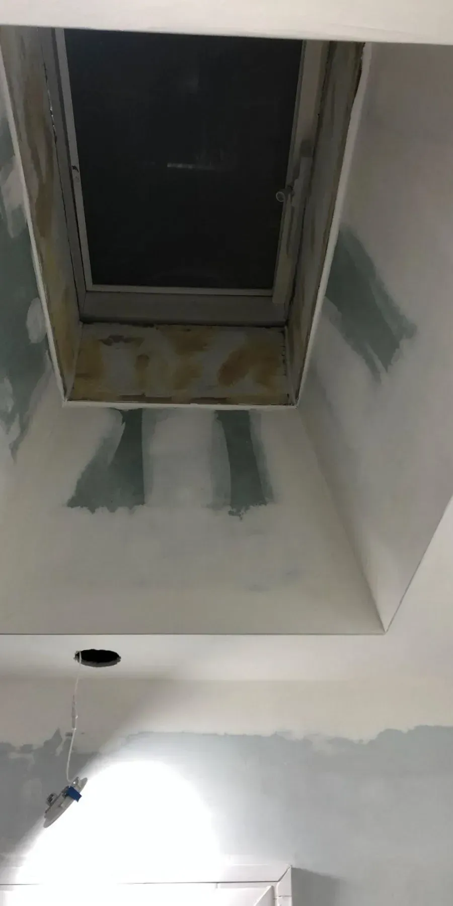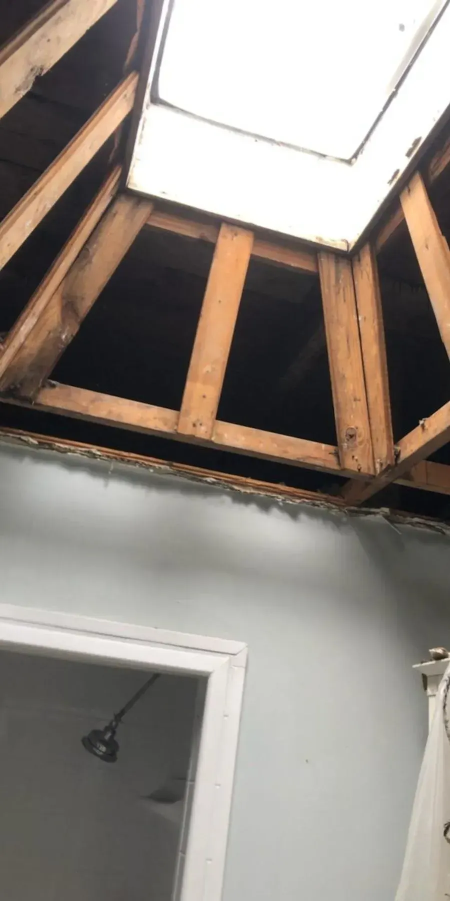 The bathroom skylight area had significant water damage and exposed framing that left the space unfinished and in need of repair. We rebuilt and refinished the skylight shaft, restoring clean lines and a smooth surface before applying a fresh coat of paint. The completed renovation brightens the room, adds depth to the ceiling, and creates a modern, refreshed look that enhances the entire bathroom.